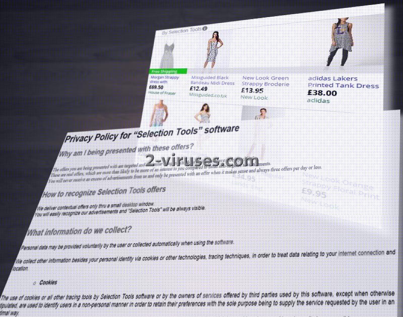 Selection Tools adware è un’applicazione che presenta un sacco di materiale commerciale. Si concentra principalmente sulla distribuzione di contenuti promozionali per i servizi di acquisto online, ma gli utenti si lamentano di essere sorpresi anche da avvisi di sicurezza, allo scopo di informarli sui virus nei loro dispositivi. In teoria, gli utenti potrebbero incontrare utili offerte. Tuttavia, Selection Tools non è un software di annunci affidabile. Il programma spiega che verranno visualizzate tre offerte al giorno, ma abbiamo la cattiva sensazione che agli utenti ne verranno presentate un maggior numero di promozioni. Gli annunci di Selection Tools sono spiegati per essere rilevanti per gli utenti e vengono visualizzati in una finestra (la sua dimensione è simile a un banner regolare).